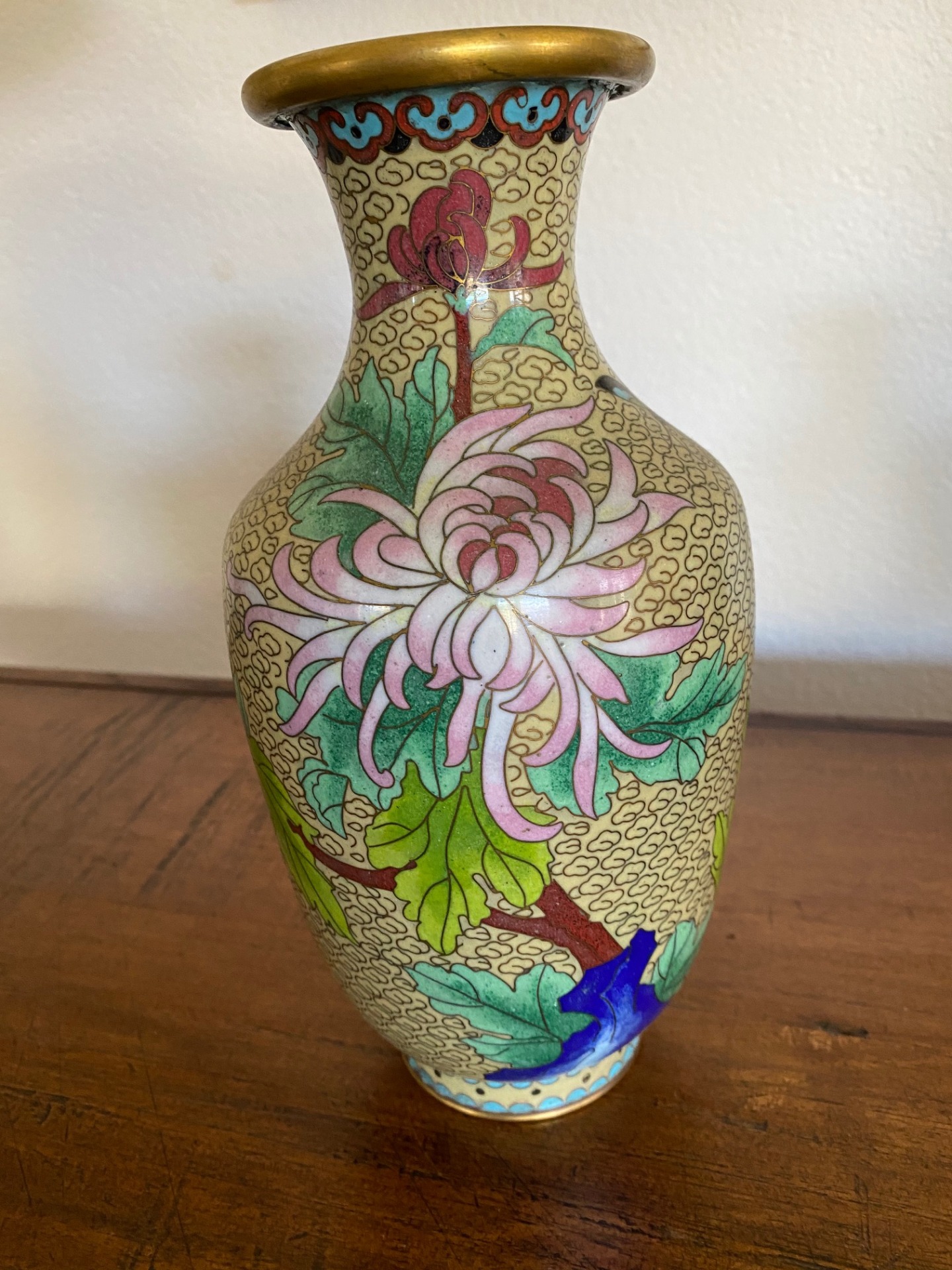 Zeer mooie vaas, met koper ingelegd. 24 cm. hoog x 12 cm. breed